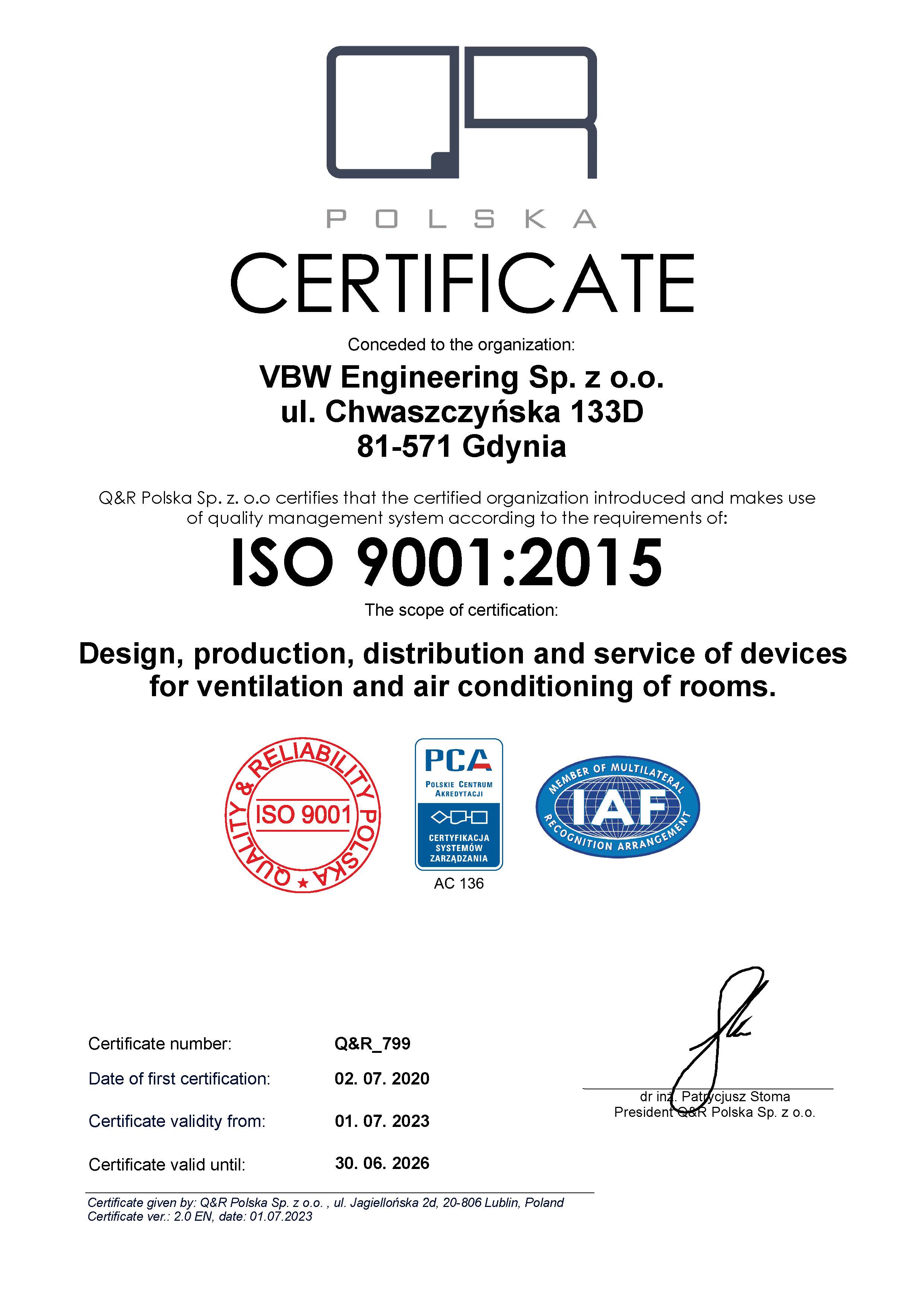 Certyfikat Systemu Zarządzania jakością wg ISO 9001 jest światowym standardem zarządzania przedsiębiorstwem, potwierdzającym, iż świadczone przez firmę usługi są zgodne z odpowiednimi normami oraz spełniają najwyższe standardy jakości.