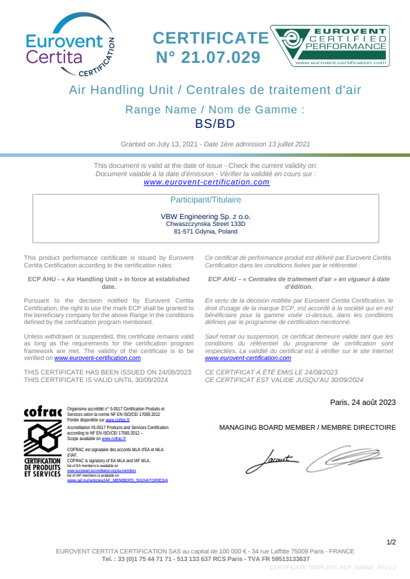 Certyfikaty EUROVENT wydawane są przez branżową organizację europejskich producentów urządzeń wentylacyjnych i klimatyzacyjnych EUROVENT CERTIFICATION COMPANY. Umożliwiają one otrzymanie przez projektanta czy inwestora pewności, iż oferowany wyrób poprzez parametry zawarte w katalogach wydruk danych technicznych wygenerowany w programie doboru urządzeń.