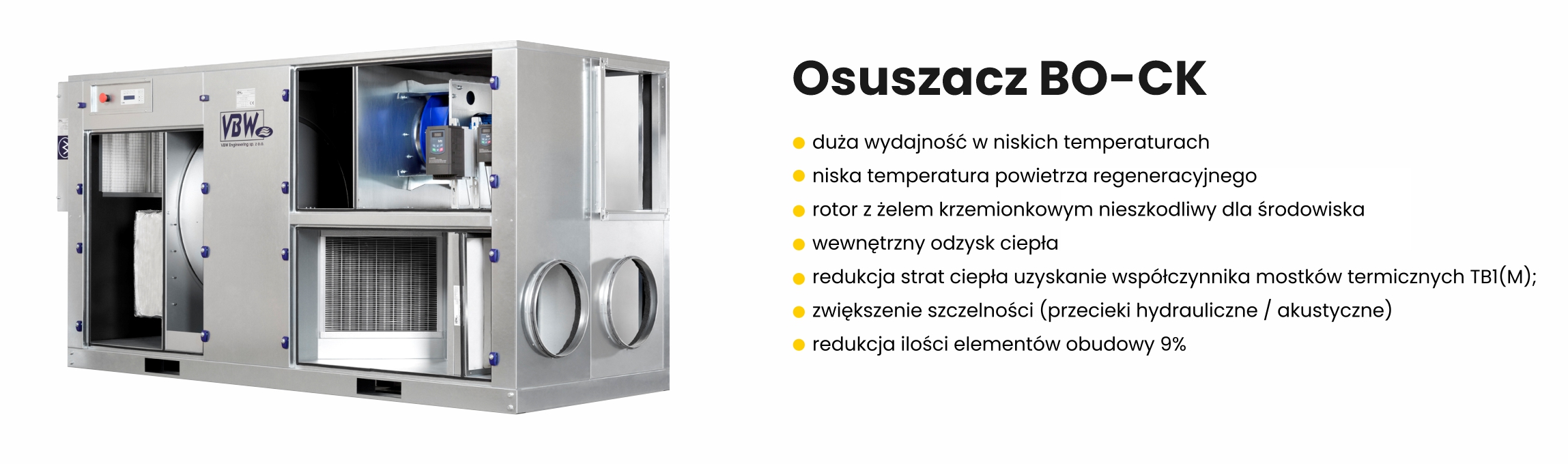 VBW Engineering posiada w swojej ofercie szereg różnych rozwiązań i urządzeń, które pozwalają na dostosowanie warunków w pomieszczeniu. Rozwiązania pozwalającym, na odprowadzanie nadmiaru wilgoci, jest sorpcyjny osuszacz powietrza BO-CK. Jest to innowacyjne urządzenie, używane w instalacjach wentylacyjnych, gdzie jednym z najistotniejszych parametrów obróbki jest zachowanie niskiego poziomu wilgotności powietrza procesowego. Aktualnie w typoszeregu posiadamy 7 wielkości centrali, jednak nie wprowadzamy ograniczeń dotyczących zaprojektowania większych urządzeń. Za każdym razem dajemy możliwość dostosowania urządzenia do indywidualnych potrzeb, szczególnie w zakresie zastosowanych materiałów i wydatku powietrza.