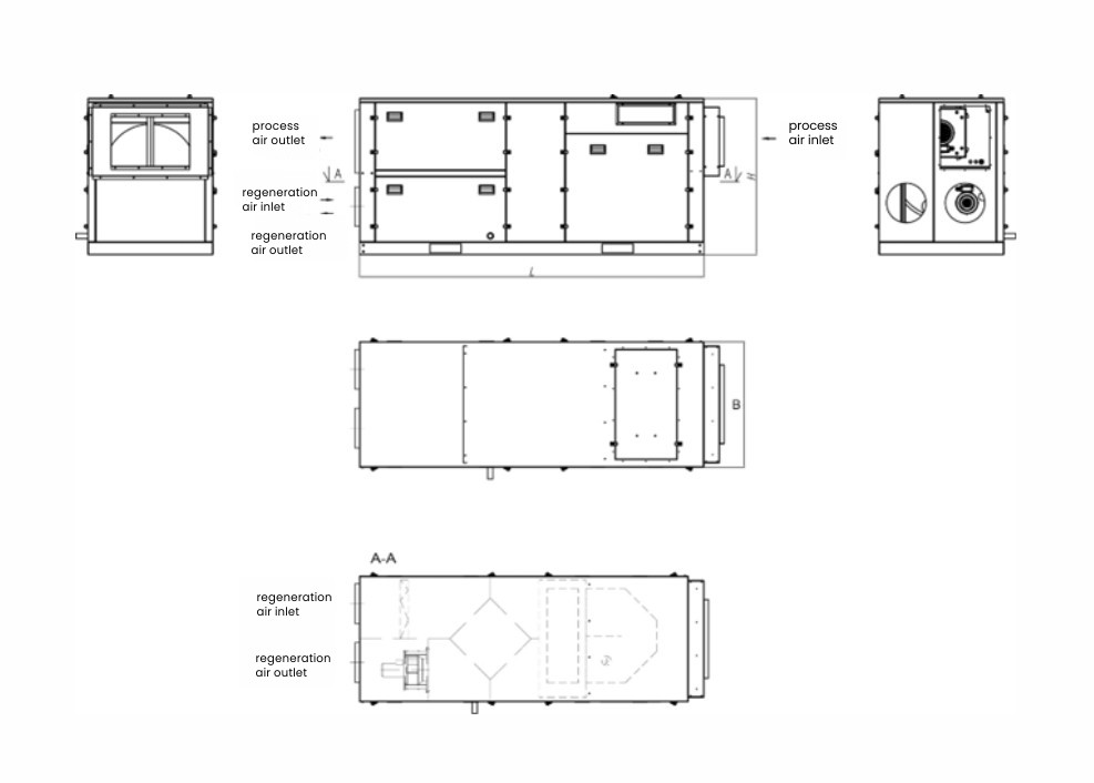 Осушувач працює за принципом поглинання вологи через спеціально підготовлений ротор на основі адсорбенту. Ротор нечутливий до тривалих періодів простою осушувача, а це означає, що навіть повне насичення вологою не впливає на продуктивність пристрою. Осушувач працює з двома повітряними потоками різного розміру. Більший потік повітря (технологічне повітря) осушується при проходженні через осушувач, тоді як менший потік (регенераційне повітря) використовується для збору накопиченої вологи і виведення її за межі осушувача.