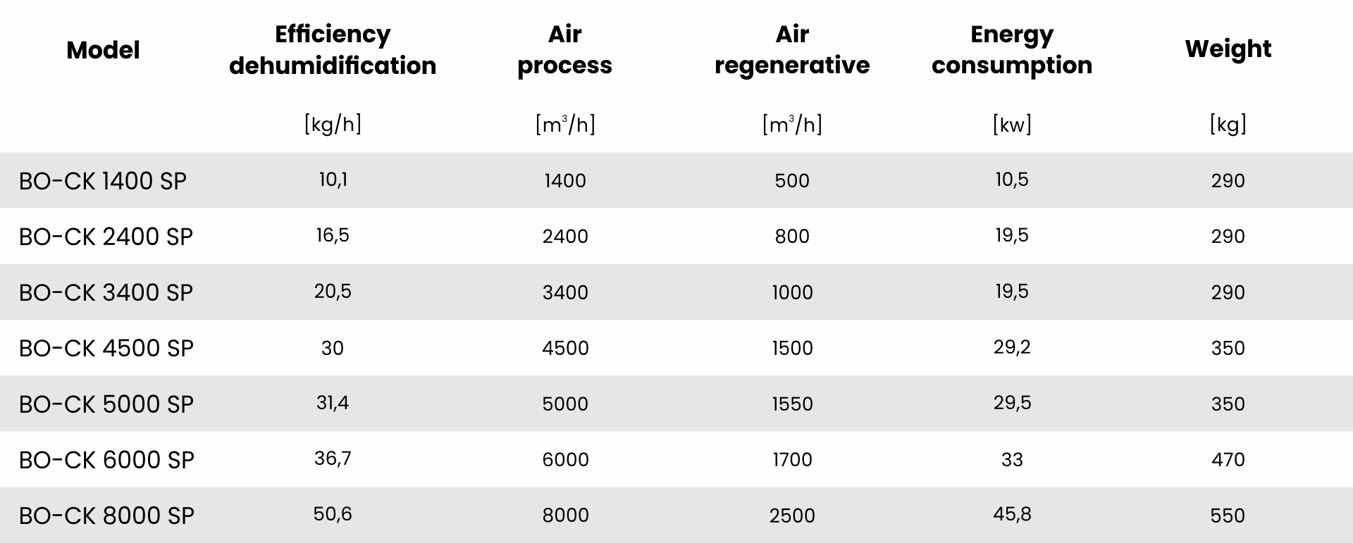 Осушувач повітря BO-CK - це інноваційний пристрій, який використовується в системах вентиляції, де одним з найважливіших технологічних параметрів є підтримка низького рівня вологості технологічного повітря. Стандартно установка виготовляється в 7 типорозмірах, що охоплюють продуктивність від 1400 до 8000 м³/год. Агрегат підготовлений для установки всередині приміщень.